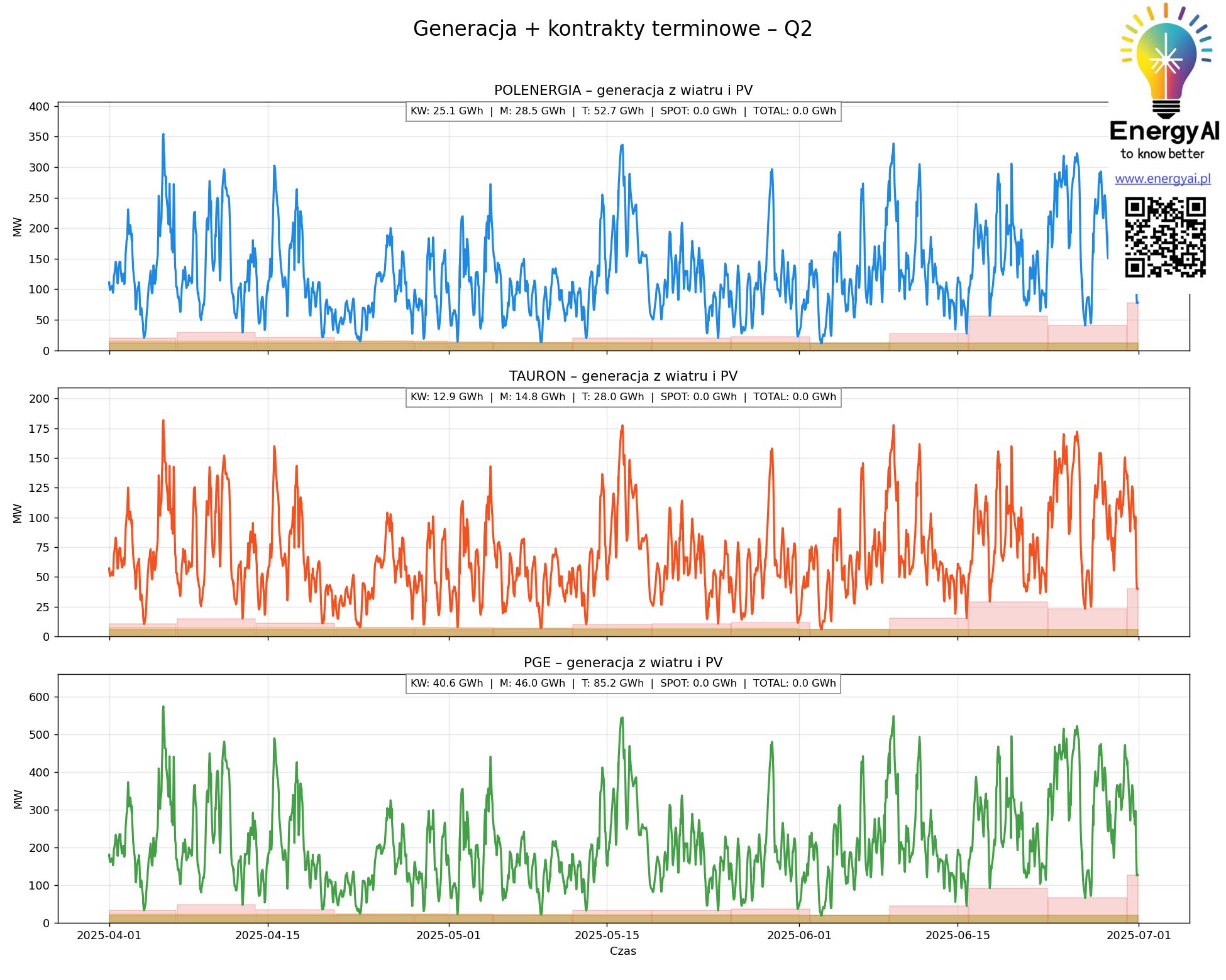 Kontrakty terminowe wpisane w profil generacji POLENERGII, TAURON Zielona Energia i PGE Energia Odnawialna w Q1, Q2, Q3 2025.