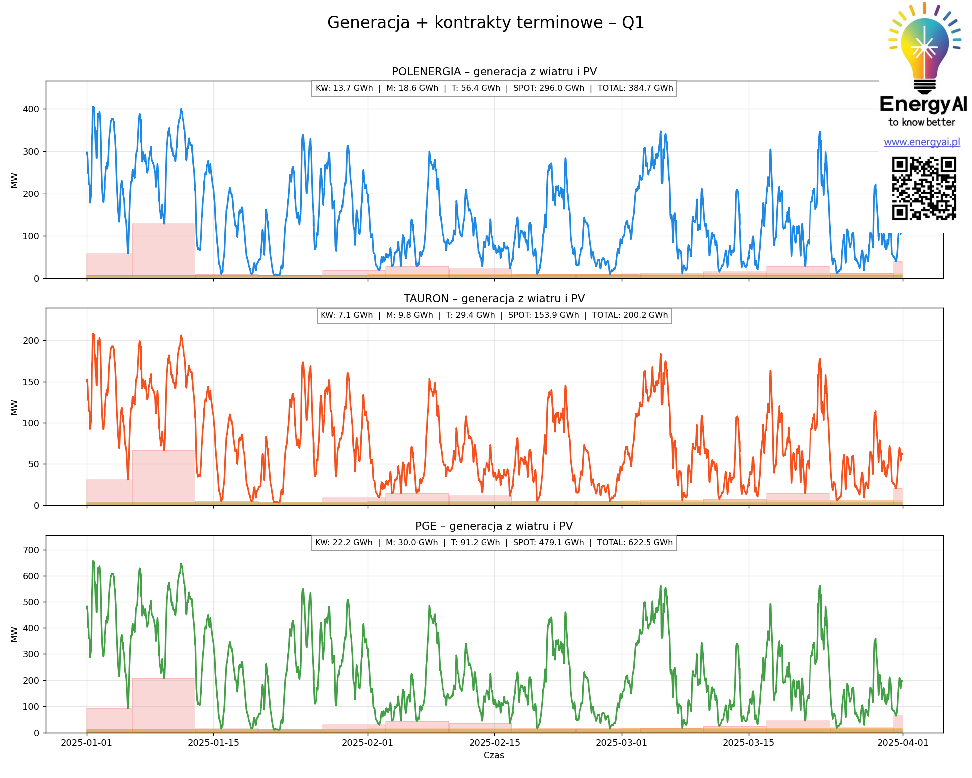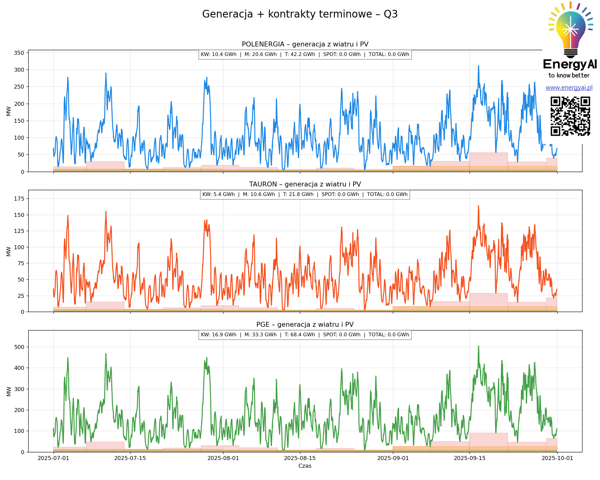 Kontrakty terminowe wpisane w profil generacji POLENERGII, TAURON Zielona Energia i PGE Energia Odnawialna w Q1, Q2, Q3 2025.