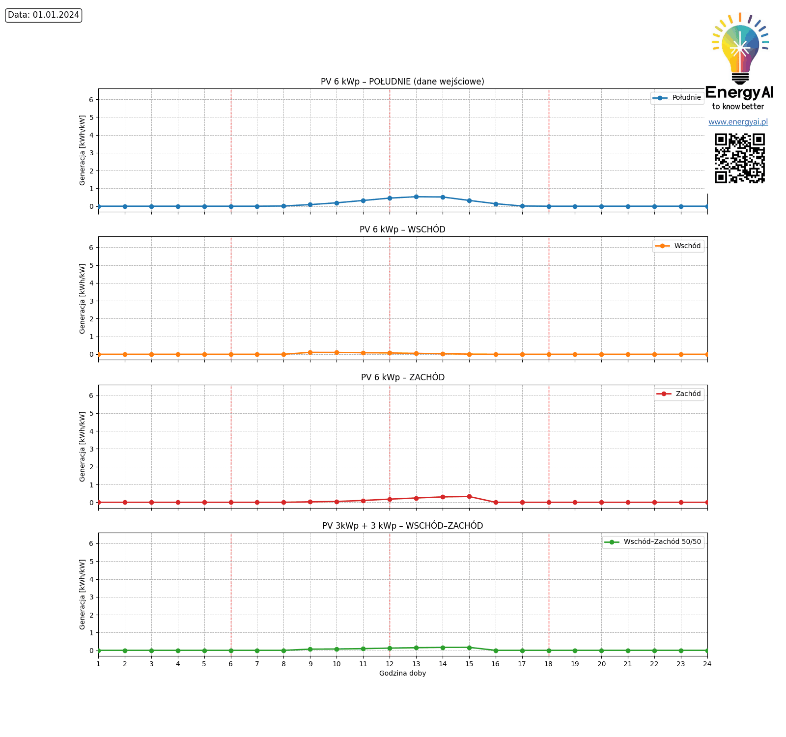 Generacja instalacji fotowoltaicznej 6kWp w roku 2024 usytuowanej w kierunku południowym, zachodnim, wschodnim i zachodnio-wschodnim.